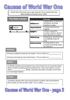 A two-page worksheet explaining the causes of World War One in simplified terms.